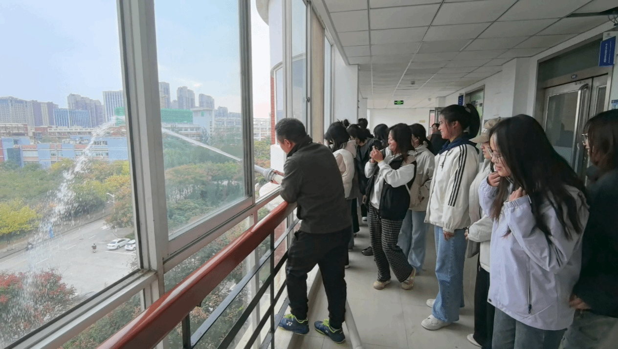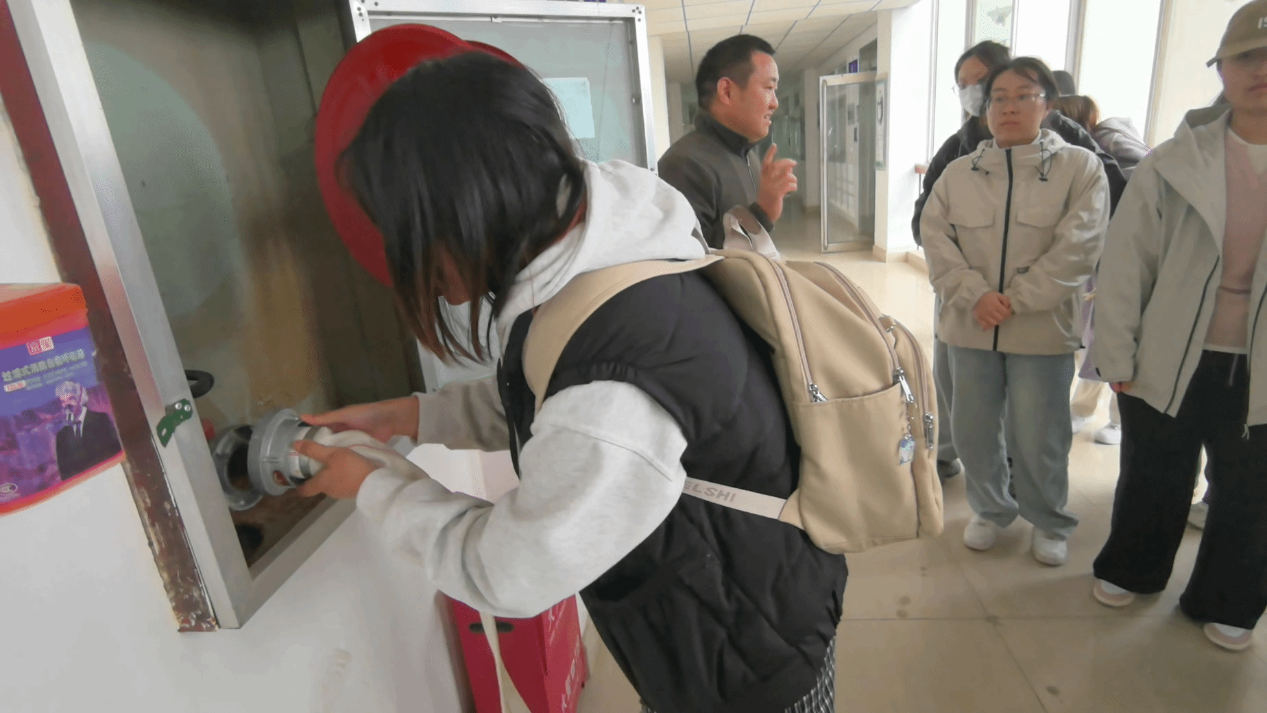 最后,在地学楼6楼的环境科学实验室,王洋洋老师展示了消火栓“一甩、二接、三开”的操作流程,同学们亲自上手操作了水枪、水带、消火栓阀门的对接步骤。王老师还讲解了喷淋器启动条件与洗眼器的应急使用场景,收到了很好的效果。