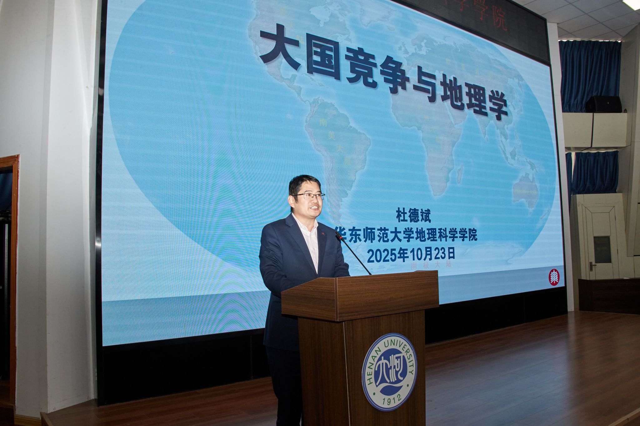 讲座伊始,丁志伟对杜德斌教授进行了简要介绍,并代表地理科学与工程学部对他的到来表示热烈的欢迎。报告以“大国竞争与地理学”为主题,紧密围绕当前国际格局的深刻变革展开,系统剖析了现代地理学与大国竞争的历史渊源,从世界进入新的大国竞争时代、现代地理学起源于大国竞争、地理科学理论服务大国竞争、新时代中国地理学的使命等四个方面进行了详细阐述。在理论重构方面,他指出新时代中国地理学需要超越传统地缘理论中的零和博弈逻辑,将“生存空间”的竞争思维转化为“共生空间”的合作理念,将“心脏地带”拓展为生态与发展的地理枢纽,为全球治理提供指引。在学科创新方面,他指出要深化世界地理学科建设,打造“中国发展全球变局”交叉融合课程与动态教材体系;依托“一带一路”实践平台,开展地缘政治分析、跨国项目模拟等实战教学,着力培养兼具地理空间智能、国际政经洞察力与战略决策能力的复合型创新人才。在范式转型方面,他指出要聚焦大国博弈关键区、“一带一路”区域,深化区域国别研究,推动研究范式从静态描述“区域差异”转向动态追踪“区际联系”,挖掘不同地区在全球网络中的共生价值为跨区域合作和治理提供学理依据。在强化地理学现实作用方面,他引用胡焕庸先生的“地理学研究既要用‘显微镜’,横察中国现世;更须用‘望远镜’,纵观世界大势”和《世界地理大会宣言》的“面对百年未有之大变局,中国地理学人肩负新的历史使命,应树立更加宽广的世界眼光,赶上时代,引领时代”等内容,认为中国地理学不仅要为国家的全球战略与安全提供智力支撑,更要为构建人类命运共同体贡献学科力量。报告最后,杜德斌分享了国内在世界地理与区域国别研究领域的前沿进展,展示了已上线的全球创新研究网站,提出了全球创新策源地图平台的研究思路与应用前景。