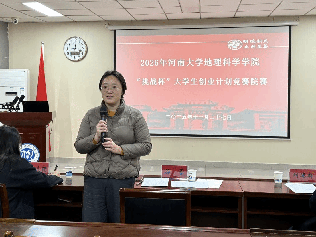 为提升大学生的职业规划能力与创新创业水平,培育高素质创业型人才,2025年11月27日上午,河南大学地理科学学院2026年“挑战杯”大学生创业计划竞赛(研究生组)院赛在地理科学学院二楼报告厅顺利举行。河南大学地理科学学院副院长谷蕾,学院教务办主任刘德新、学院教师屈利铭、田海峰及李阳等出席赛事并担任评委。比赛由24级硕士研究生杨丽萍主持。
