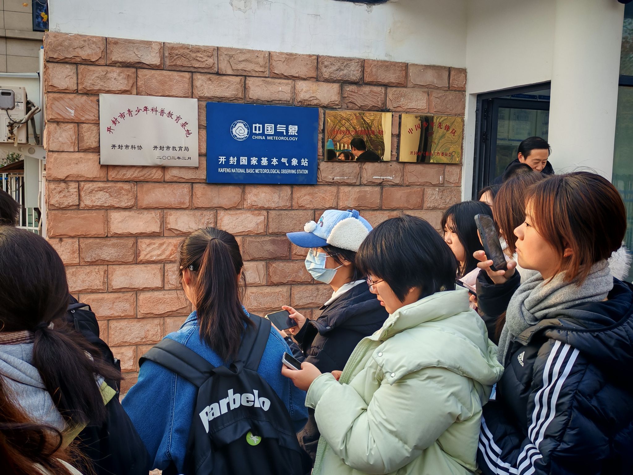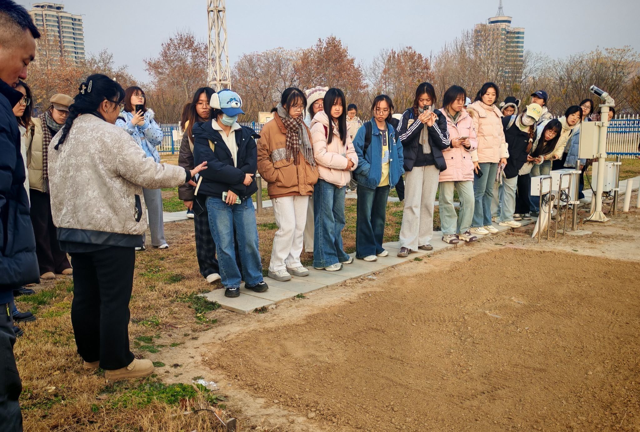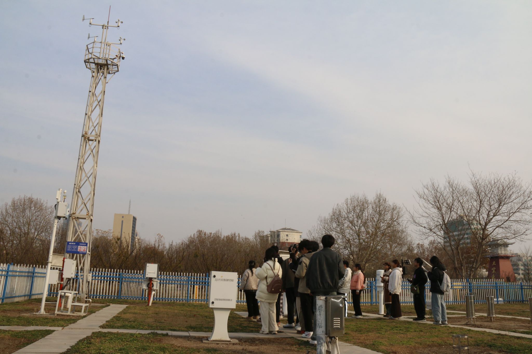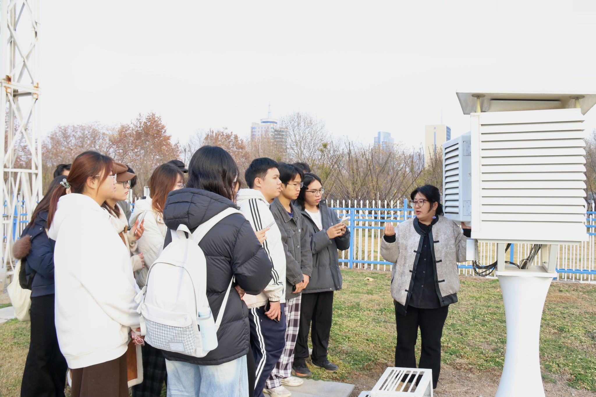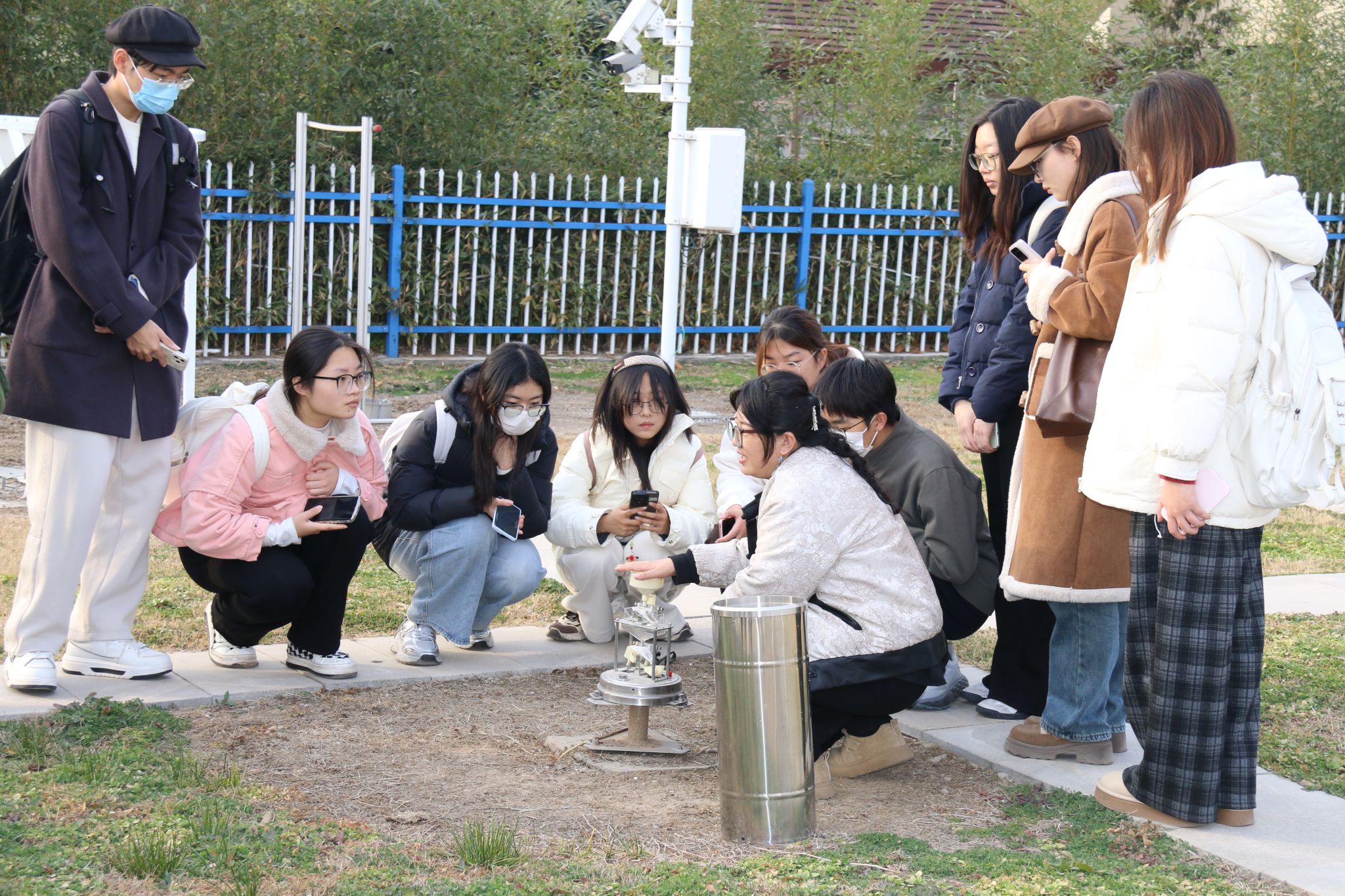 另一组学生赴开封市国家基本气象站开展现场观测学习。在工作人员的讲解下,学生们近距离接触气象观测铁塔、百叶箱、降水现象仪、翻斗式雨量计、地温观测装置、雪深监测仪等多类设备,认真记录仪器运行方式与观测规范,进一步夯实了气象观测基础。