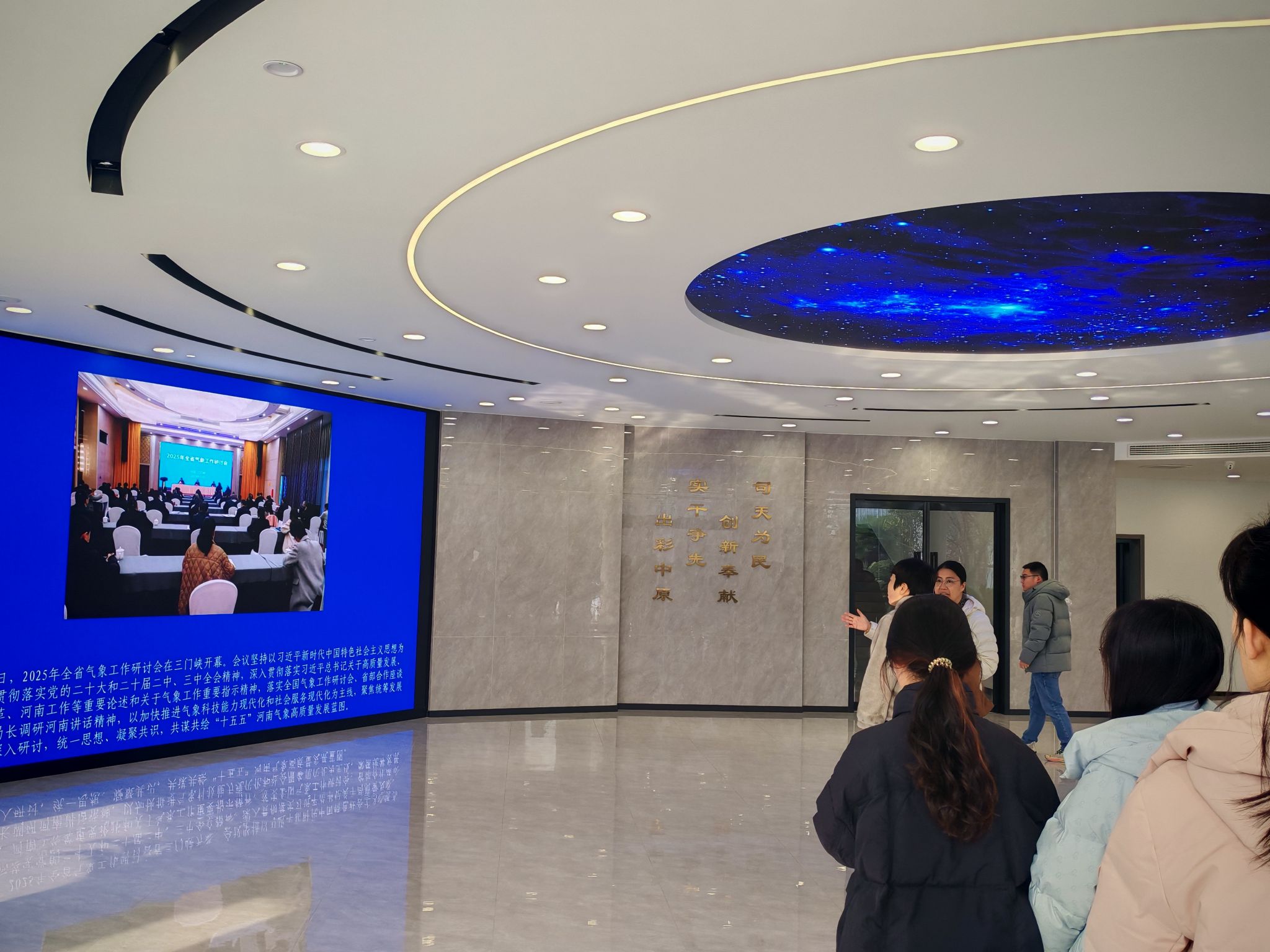 当日下午,实习队伍前往开封市气象局,在工作人员的引导下依照既定路线开展学习参观。在气象局大厅,开封市气象局副局长李跃华首先向同学们介绍了河南省气象站点分布及开封市气象局在区域气象服务中的重要地位,重点讲解了气象观测、预报预警、防灾减灾等核心业务内容,并勉励同学们关注气象事业发展,将青春力量投入到服务气候安全的实践中。