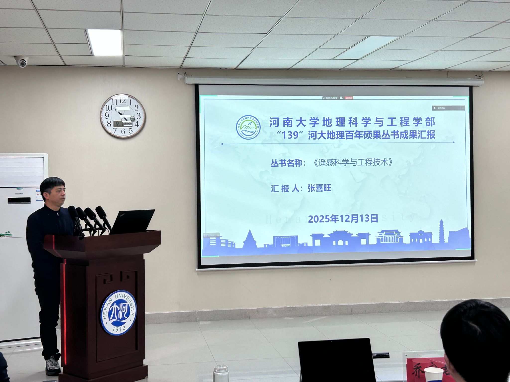 2025年12月13日上午,百年地学硕果丛书“139工程”成果汇报会在河南大学金明校区地学楼二楼报告厅举行。本次会议由地理科学与工程学部地理科学学院副院长丁志伟主持,河南大学学术副校长、地理科学与工程学部主任刘彦随,地理科学与工程学部委员、地理科学学院党委书记乔家君,河南大学出版社高等教育出版中心主任郑鑫,各分册图书主编、副主编,以及学部学科办、教务办与各系所负责人参会。