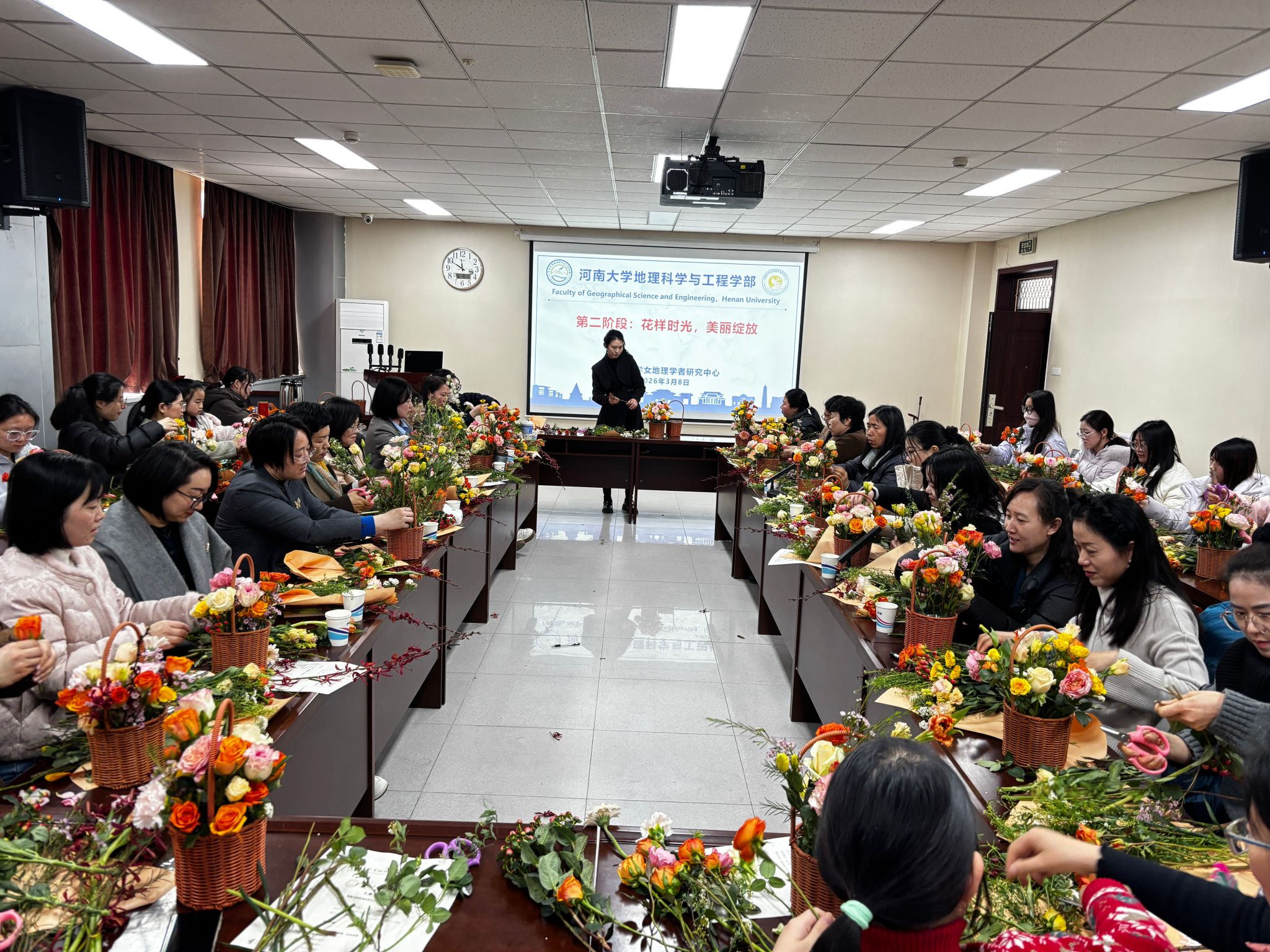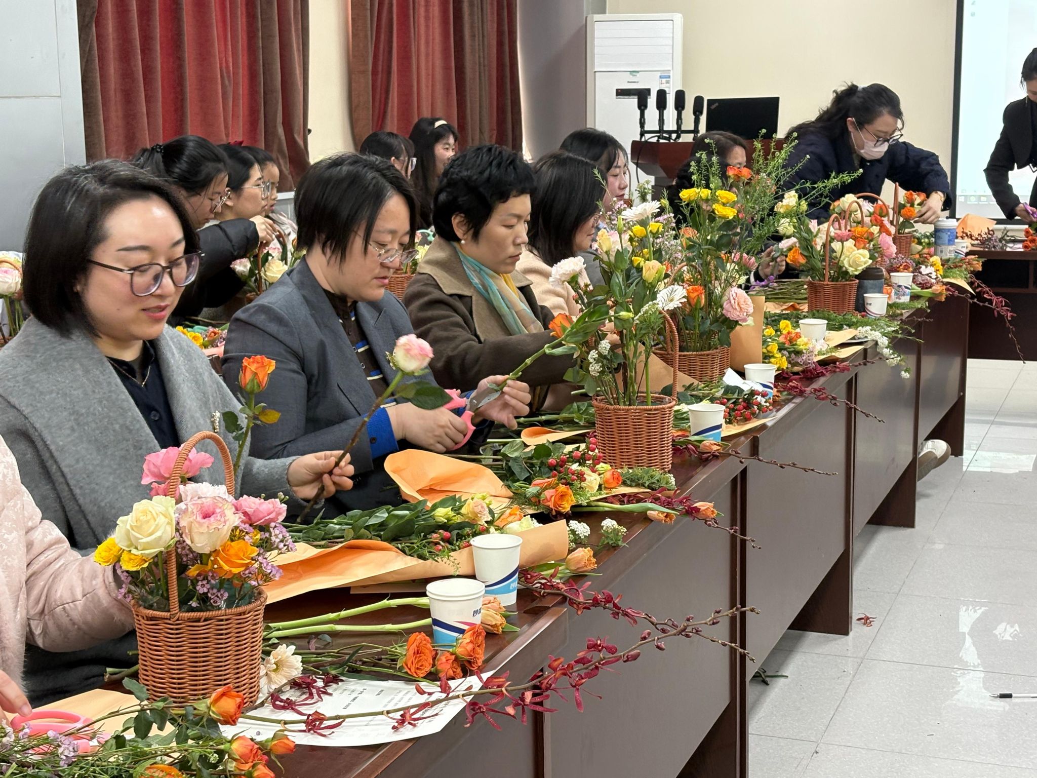 在花香漫溢间,“巾帼花语”艺术插花体验环节同步开展。女教师们精心挑选花材,修枝剪叶、搭配造型,将对生活的热爱与对事业的热忱融入花艺创作,一件件错落有致、生机盎然的插花作品逐渐呈现。大家在动手创作中舒缓身心、陶冶情操,彼此交流花艺技巧,分享创作心得,在花香与笑语中拉近了距离,增进了情谊。