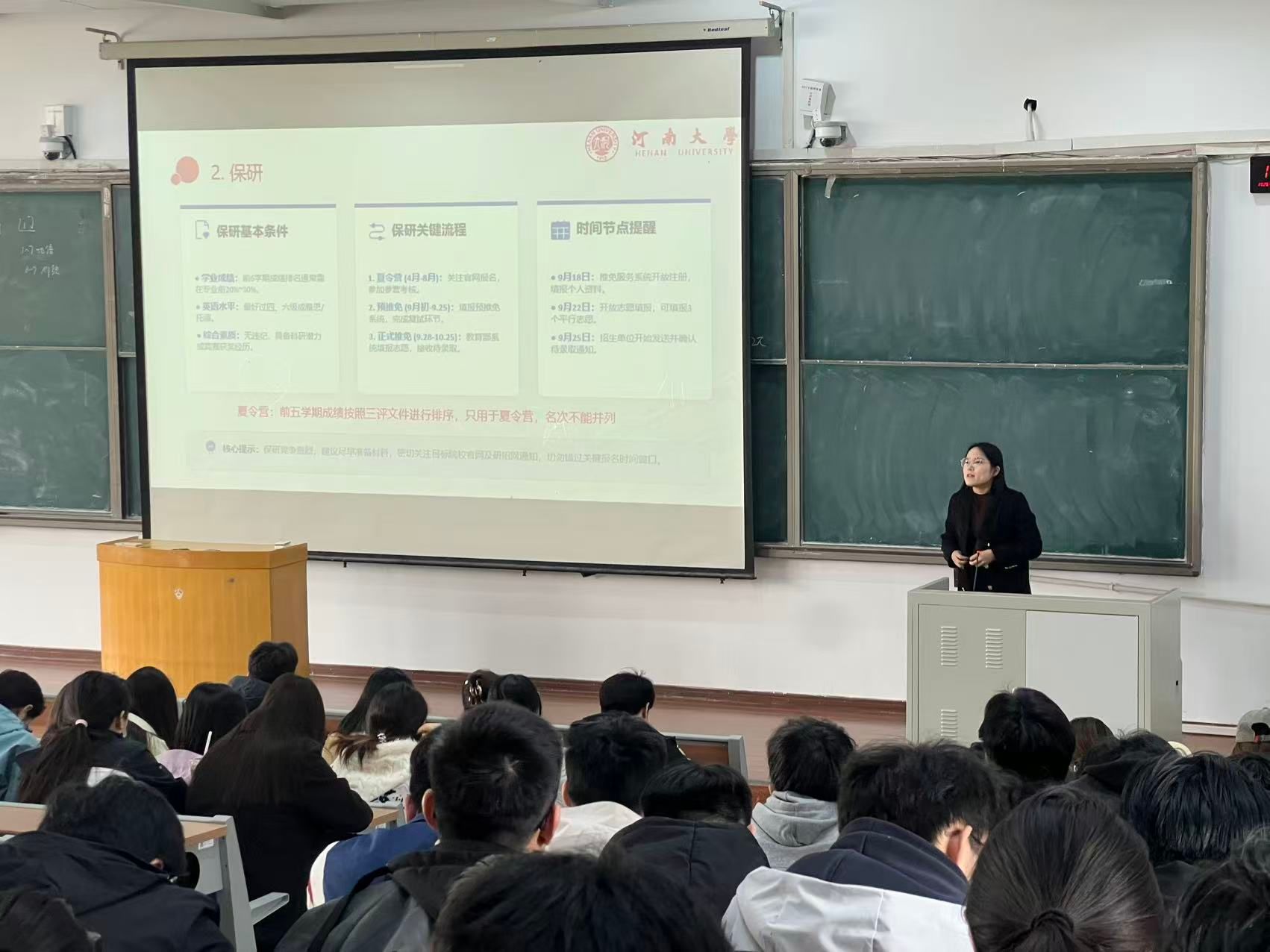在升学规划方面,屈利铭重点讲解了考研复习节奏与保研关键流程,建议学生们尽早明确目标,合理安排复习计划,夯实英语、数学等基础科目,有序推进备考进程。同时,她提醒学生们关注夏令营信息,规范整理成绩与相关材料,确保信息真实准确。