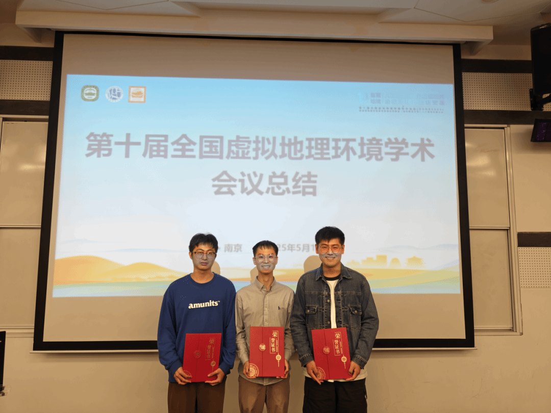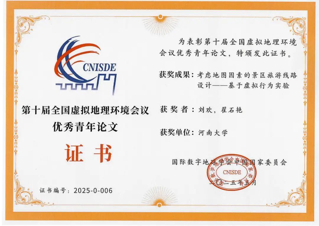 我部计算地理学实验室翟石艳教授带领课题组博士和硕士研究生积极参与,与同行专家和学者开展深入的交流和讨论,并汇报了团队的最新研究工作。博士研究生刘欢与翟石艳教授共同撰写的论文《考虑地图因素的景区旅游线路设计——基于虚拟行为实验》荣获优秀青年论文奖。李柯颉等硕士研究生提交的参赛作品《基于虚拟实验与GeoAI技术的行人过马路谨慎行为的测度与影响机制研究》以及张永豪等研究生提交的参赛作品《基于GeoAI技术的城市街道环境对行人夜间安全感知的影响测度与优化模拟研究》双双斩获2025年中国虚拟地理环境创新大赛二等奖。