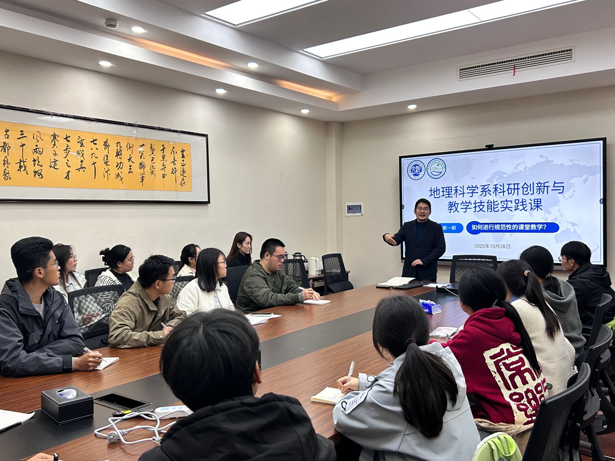 课程第二环节是理论学习。在丁志伟的带领下,全体师生共同学习了刚刚发布的《中共中央关于制定国民经济和社会发展第十五个五年规划的建议》(“十五五”规划建议)的重要精神。他一方面系统介绍“十五五”规划建议的主要内容,另一方面结合地理学科专业特色对规划建议中涉及的区域协调发展、生态文明建设、乡村振兴、美丽中国等重大战略进行了深入解读。他勉励同学们要将个人专业学习与国家发展需求紧密结合,把论文写在祖国的大地上,为实现中华民族伟大复兴贡献地理学人的智慧和力量。