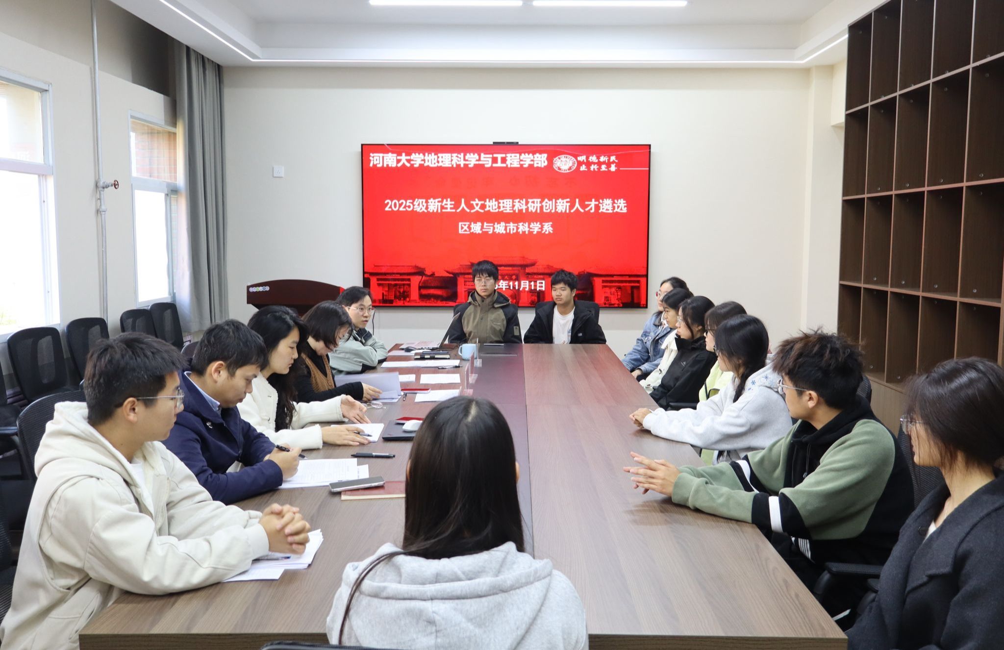 本次遴选活动设置两大核心环节,从“自我展示”到“深度问答”环环相扣、过渡自然。自我展示环节,学生需结合个人学术兴趣、数字工具应用及社会实践经历,系统阐述对人文地理学学科价值与发展前景的认知,以展现自身核心素养与个人发展规划。评委提问环节,评委从兴趣驱动、专业知识、实践技能及综合素养四个维度进行深度问询,全面评估学生的学术潜质与发展能力。整场面试组织有序、氛围严谨而融洽。学生精神饱满、表达流畅,展现出扎实的学科基础、清晰的逻辑思维与良好的科研意识,充分体现出在人文地理学领域的知识积淀与学术热忱。最后,在本次报名的14名学生中遴选出了10名具有敏锐观察力、良好逻辑思维与数据敏感度以及知识融合度较好的学生。