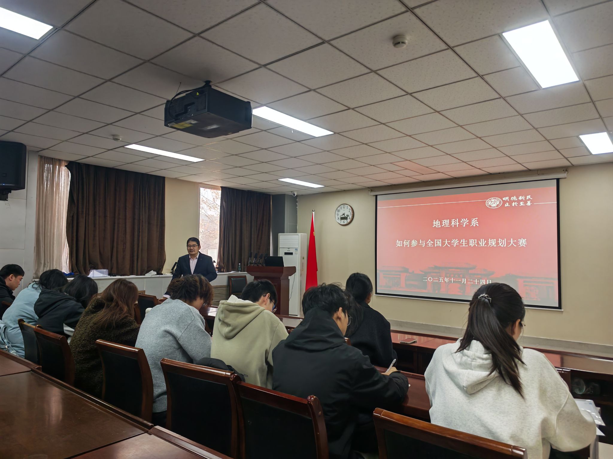 为进一步提升学生参与全国大学生职业规划竞赛的实战水平,激发青年学子创新创业热情与职业发展意识,11月24 日上午8:10至12:30,地理科学系 “STEP”创新实践课第六讲在地学楼二楼报告厅顺利举行。本次活动由2023级辅导员屈利铭老师主持,地理科学学院副院长丁志伟教授担任主讲人。