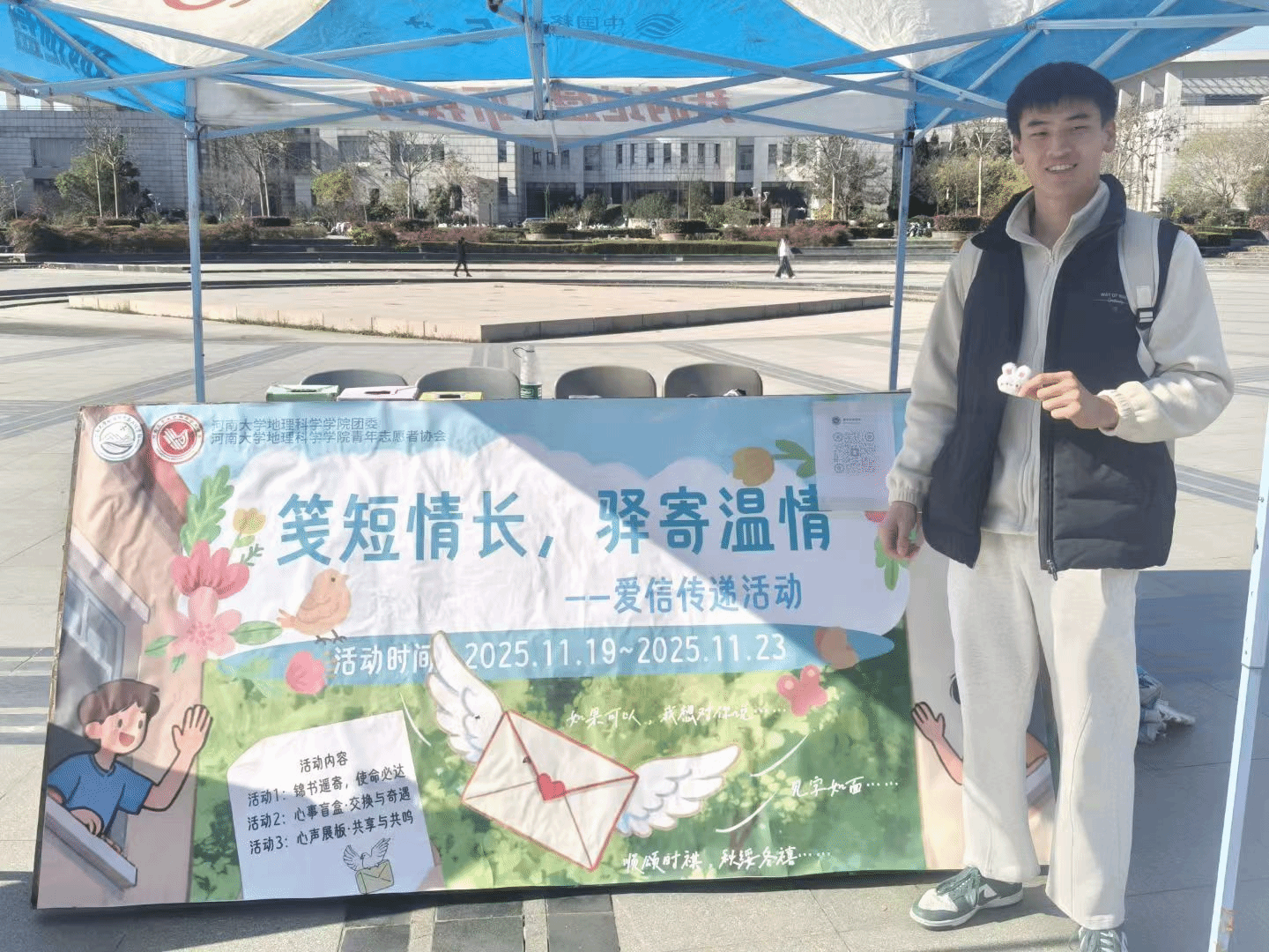 寒笺寄暖意,素纸载冬情。为传承驿寄信笺的传统文脉,消弭时空阻隔,唤醒人们心底的温柔共鸣,11月19日至23日,我部青年志愿者协会面向学校全体师生于金明校区下沉广场举办以"笺短情长,驿寄温情"为主题的"爱信传递"活动。
