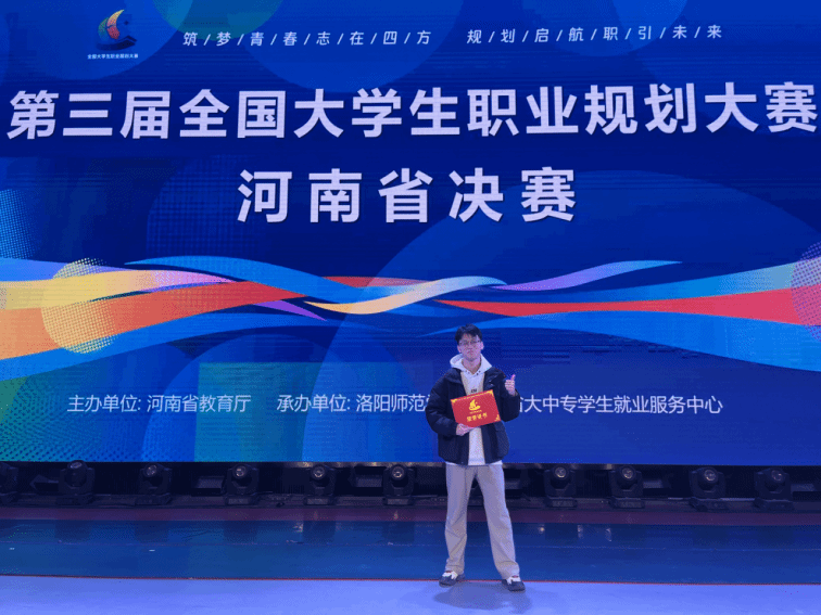 1月25日至27日,第三届全国大学生职业规划大赛河南省决赛在洛阳举办。本届大赛以“筑梦青春志在四方,规划启航职引未来”为主题,设成长赛道和就业赛道两大组别,是提升大学生职业规划能力、助力高校就业育人工作的重要平台。我校共选派六名学子参赛。其中,我部2023级本科生高怡天荣获成长赛道高教组金奖,2025级研究生段红锐荣获就业赛道研究生组铜奖。