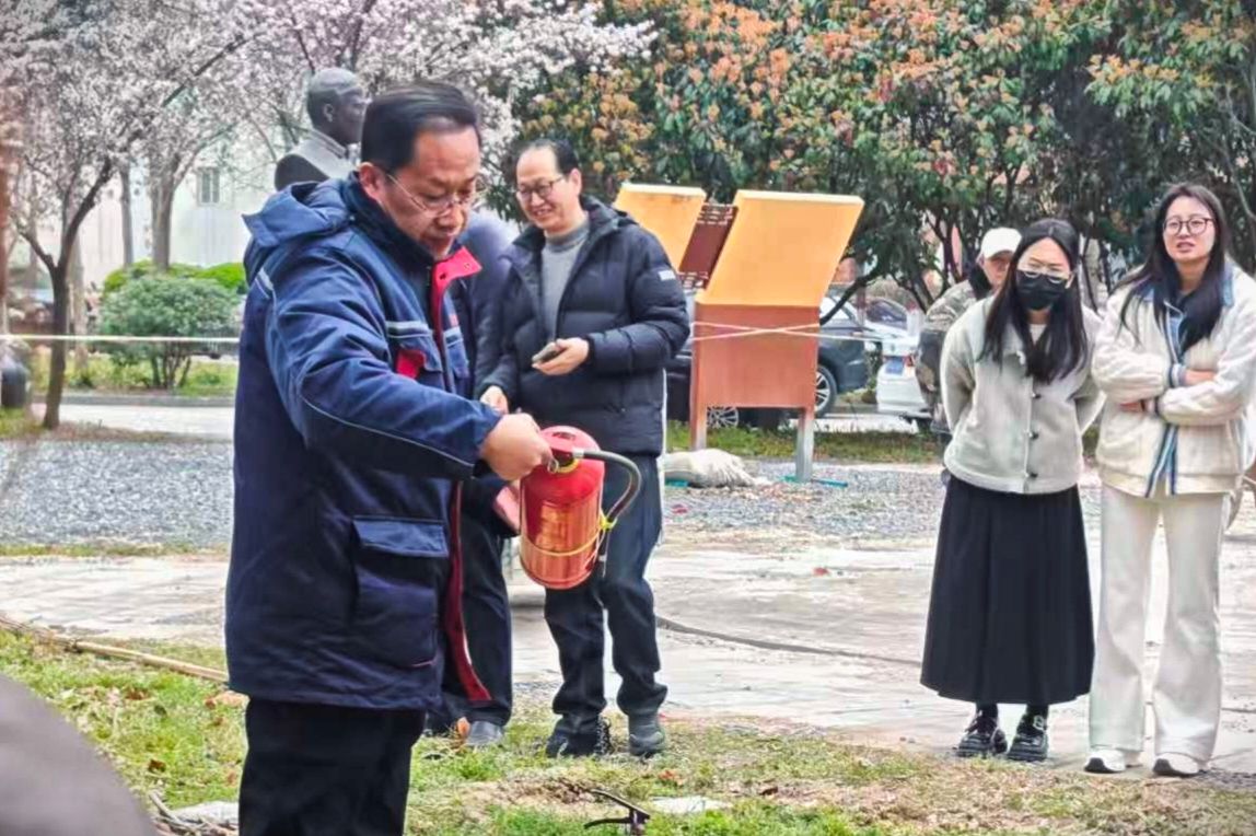 实操演示分别在景兰苑和地学楼六楼开展。在景兰苑现场,讲解员对干粉灭火器、二氧化碳灭火器、灭火毯及消防沙的使用方法进行了示范,并指导学生进行实际操作;同时讲解了护目镜、消防面罩的正确佩戴方式。在地学楼六楼,讲解员演示了消火栓“一甩、二接、三开”的操作流程,并介绍了紧急喷淋器、洗眼器的使用方法及适用情形。通过现场演练,进一步提升了师生的应急反应能力和实际操作水平。