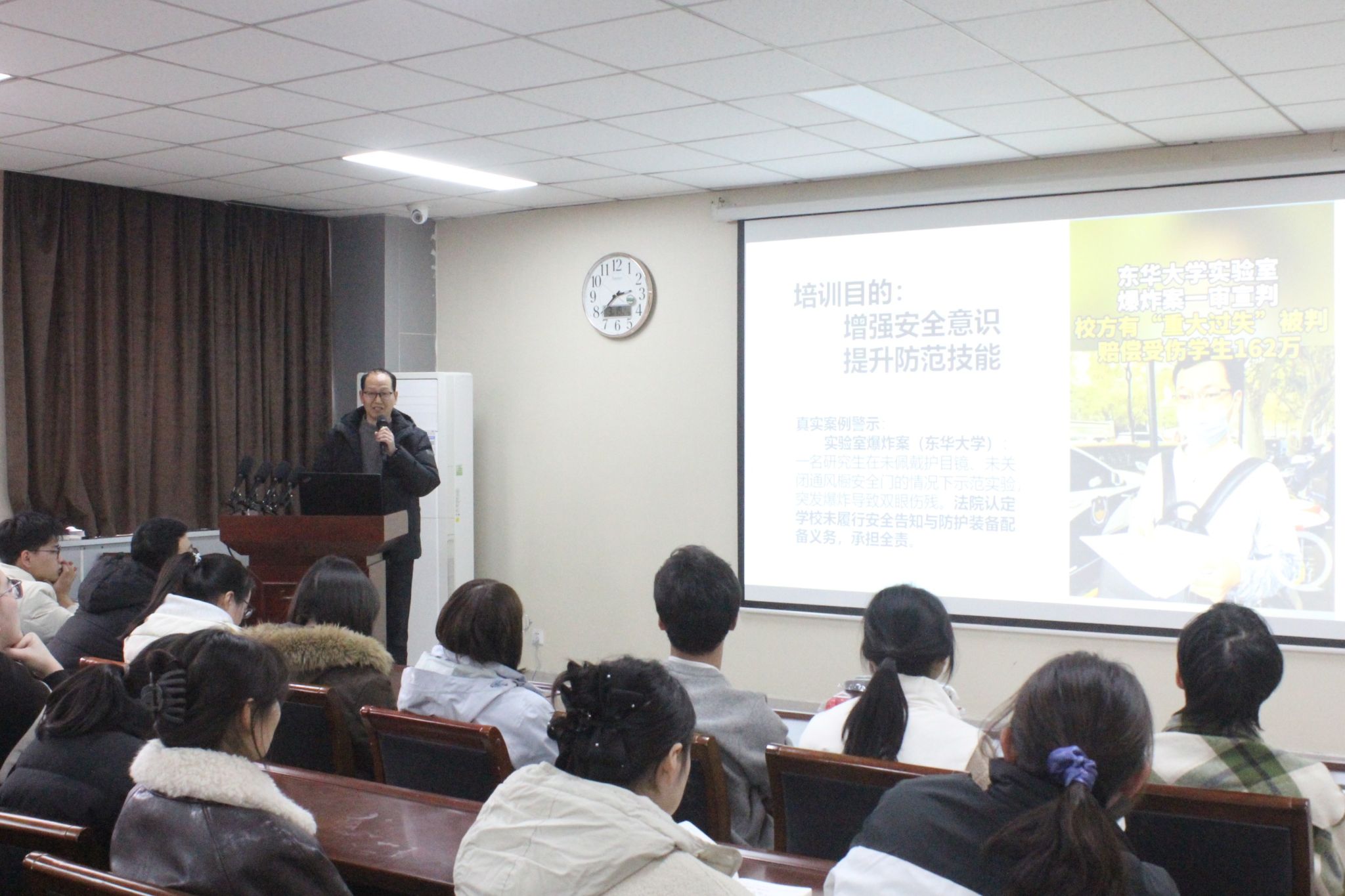在理论教学环节,学部实验室管理办公室李斌老师围绕实验室安全重点内容进行讲解,涵盖危险源辨识、消防安全规范、危险化学品与高压设备操作、个人防护装备使用、实验用电安全以及突发情况应急处置等方面。授课过程中,他结合国内高校实验室典型安全事故案例,对违规操作可能带来的后果进行了分析,强调“每个人都是实验室安全员”的责任意识,要求师生在实验过程中始终坚持安全规范,守牢安全底线。