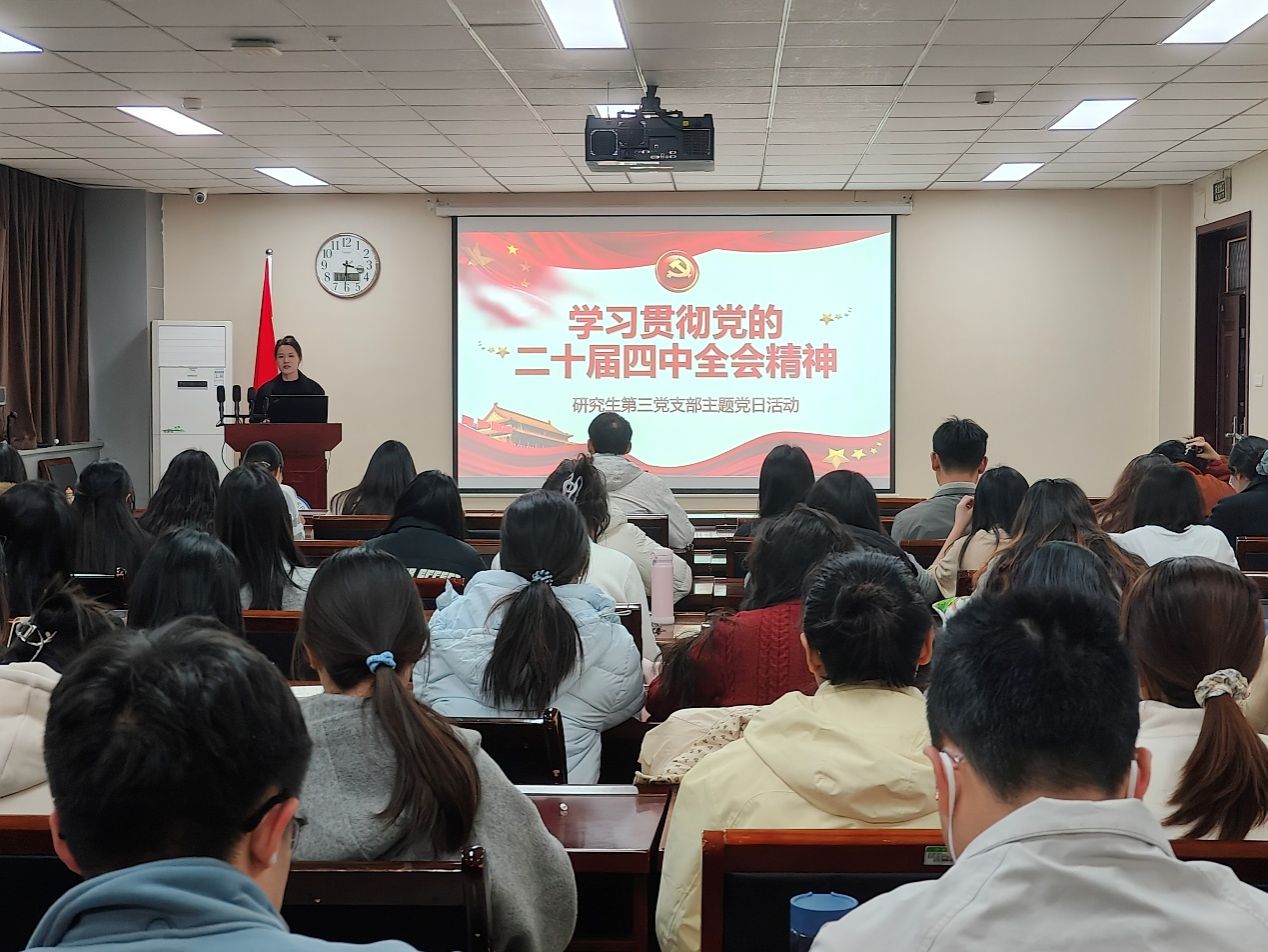 为深入学习贯彻党的二十届四中全会精神,引导青年学子将个人成长融入到国家发展大局中,11月26日下午,我部研究生第三党支部在地学楼二楼报告厅开展“学习贯彻党的二十届四中全会精神”主题党日活动。此次活动由支部书记刘方主持,支部全体党员、入党积极分子参加。