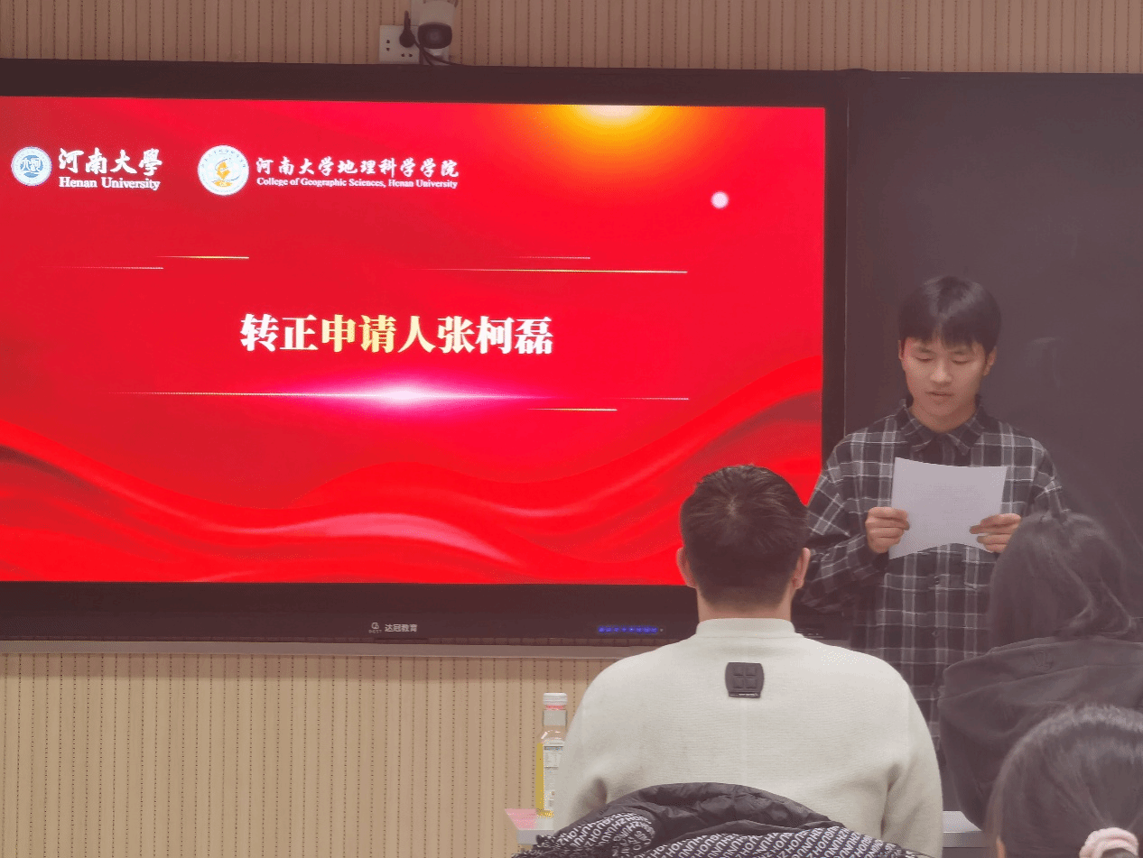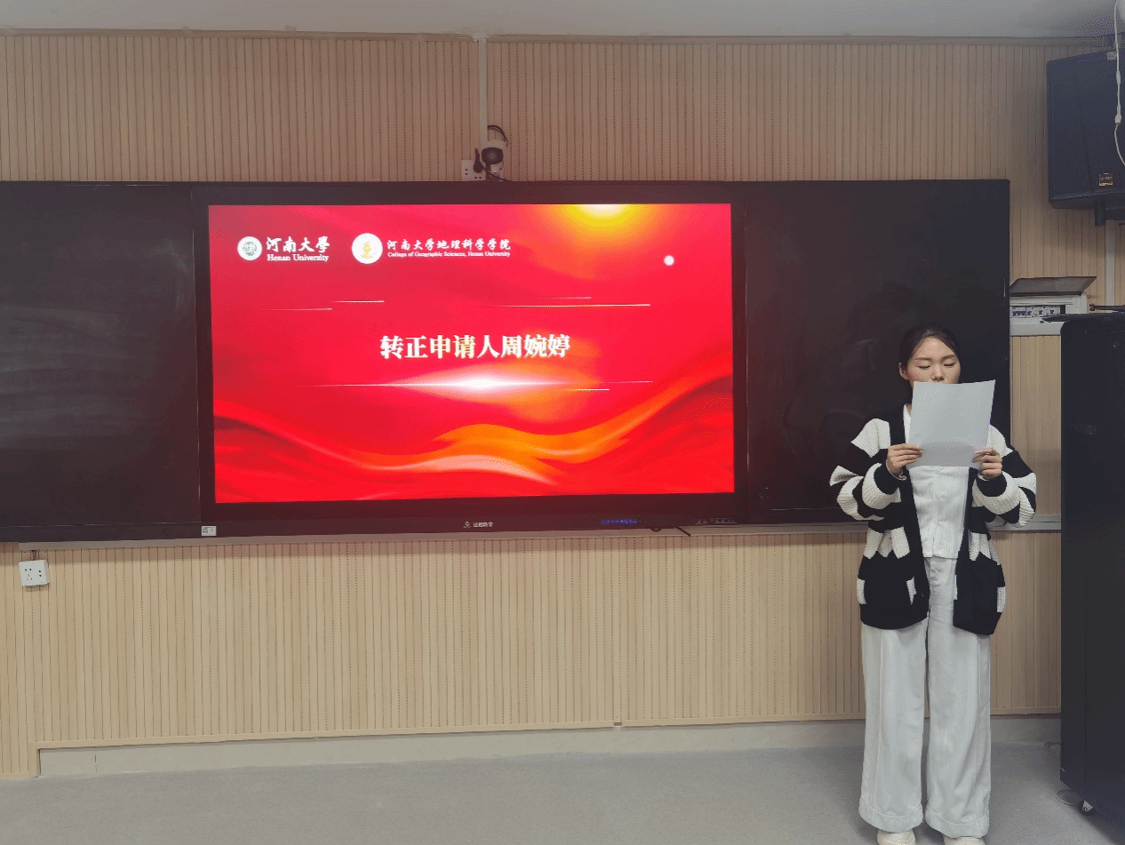 为进一步加强党员队伍建设,2025年11月29日,河南大学地理科学学院研究生第三党支部在金明校区一号楼101教室召开预备党员转正大会,顺利完成了周婉婷、张柯磊两位预备党员的转正程序。本次大会由党支部宣传委员赵祥臣同志主持,记录人为杜豫同志。应到有表决权党员29名,实到24名,请假5名,实到人数超过应到会有表决权党员的半数,符合规定,会议有效。
